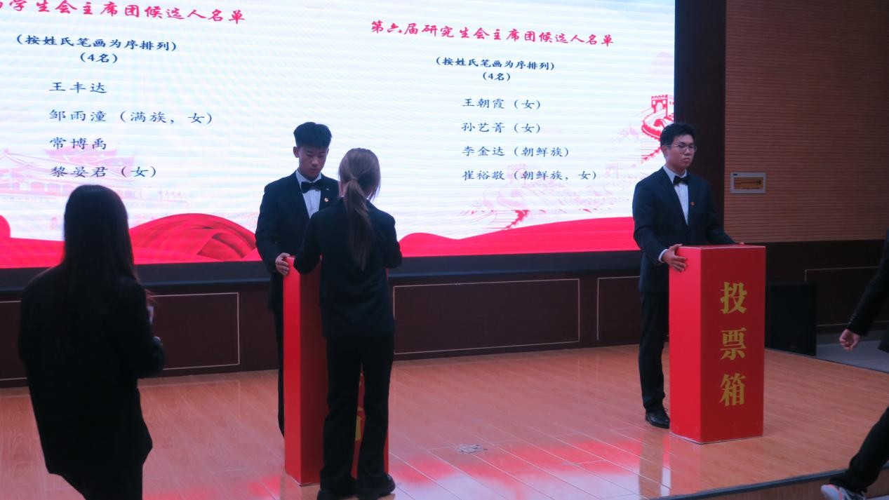 会议伊始,全体人员齐唱国歌。随后,学院党委书记金钟范致开幕辞,肯定了第六届学生会、第五届研究生会的工作成果。会议听取了第六届学生会、第五届研究生会工作报告,宣读了代表资格审查报告,表决通过选举办法(草案),并依照相关规定选举产生第七届学生会主席团与第六届研究生会主席团成员。选举结果公布后,新一届学生会、研究生会主席团成员代表作工作展望并宣读倡议书。会议还为卸任学生干部颁发荣誉证书及奖品,最后,全体人员齐唱校歌,大会圆满落幕。